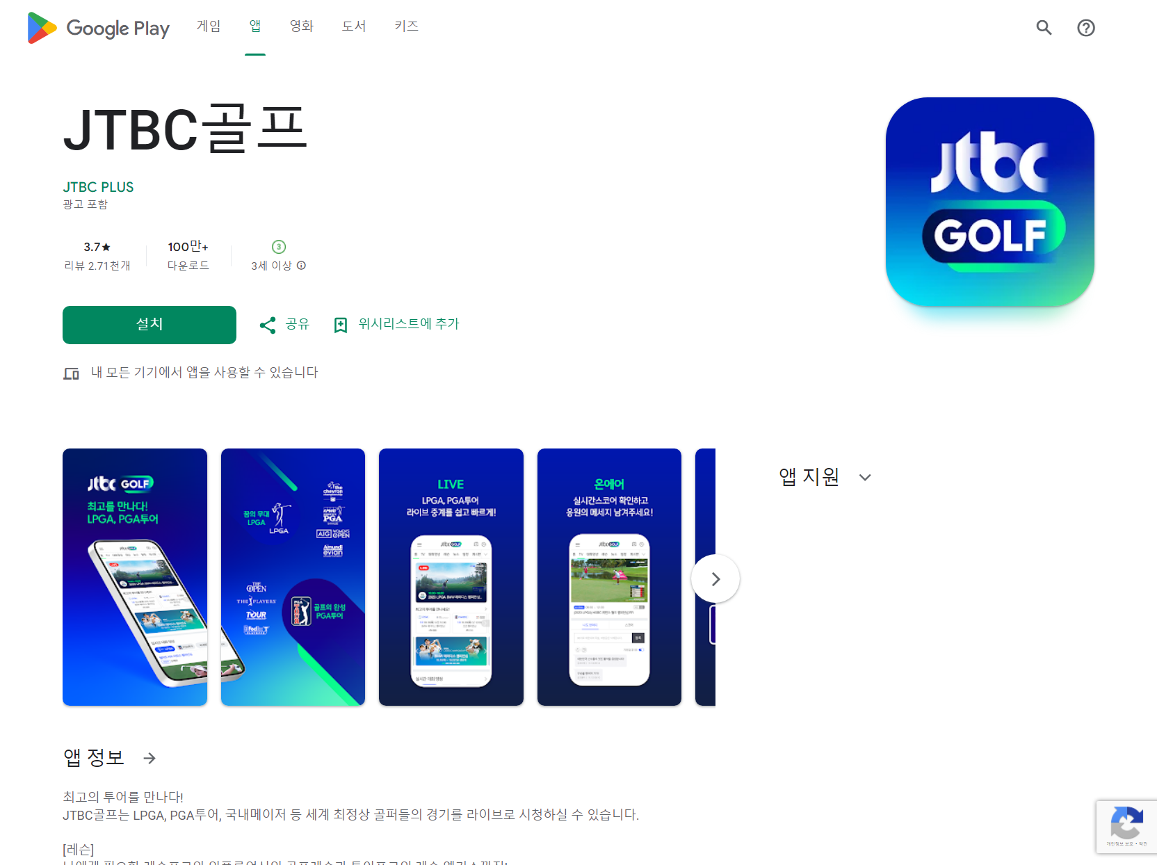 JTBC 골프 앱은 JTBC PLUS에서 제공하는 공식 앱으로, 100만 이상의 다운로드 수를 기록하고 있습니다. 현재 Google Play에서 3.7의 평점을 보유하고 있으며, 약 2,710개의 리뷰가 등록되어 있습니다. 이 앱은 3세 이상 이용할 수 있는 콘텐츠를 제공하며, 모든 모바일 기기에서 원활하게 작동합니다. 최근 업데이트는 2024년 7월 21일에 이루어졌으며, 새로운 기능과 버그 수정이 포함되었습니다.